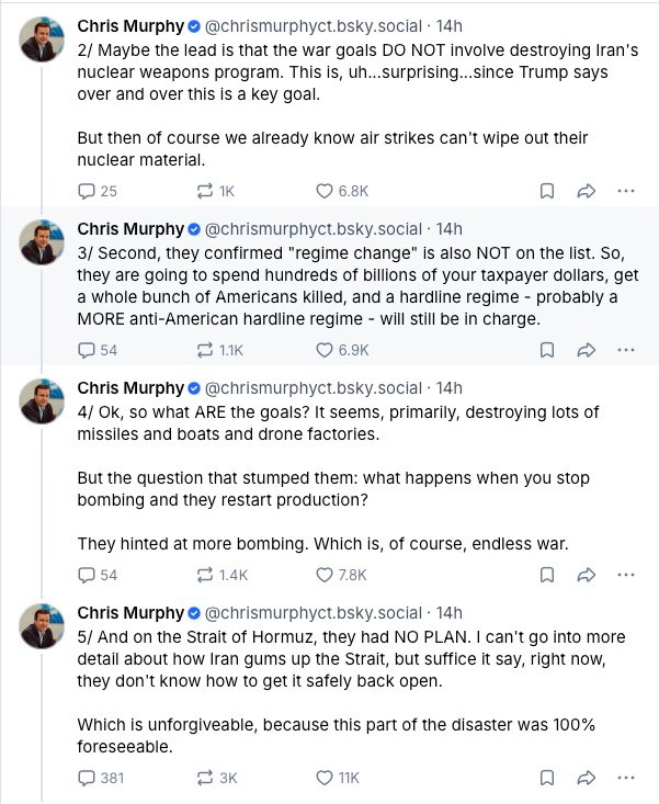 I was in a 2 hour briefing today on the Iran War. All the briefings are closed, because Trump can't defend this war in public. I obviously can't disclose classified info, but you deserve to know how incoherent and incomplete these war plans are.